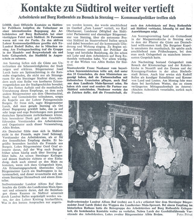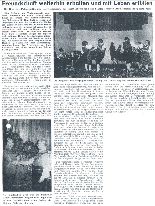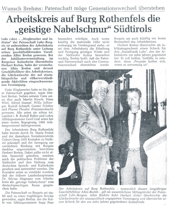 Vom 15. – 18.10. fand in Schlanders eine weitere Internationale Begegnung statt. Landeshauptmann Dr. Silvius Magnago sprach zum dem Thema „Die politische Situation in Südtirol“. Am 21. Mai fand ein Festakt zum 10-jährigen Bestehen der Patenschaft mit der Stadt Lohr statt. Albin Brehm überbrachte die Glückwünsche und einen Scheck des Arbeitskreises. Er erhielt zusammen mit Bürgermeister Gerd Graf die Burgeiser Verdienstnadel.