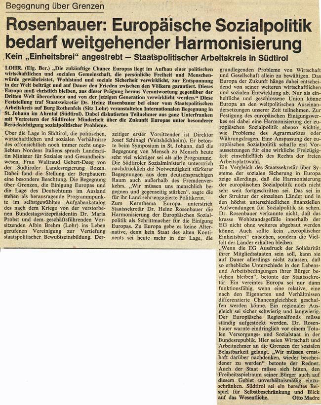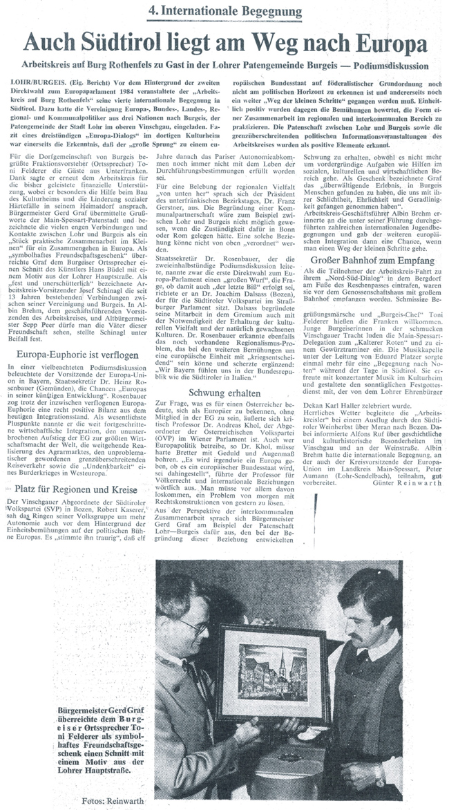 Vom 30.09. – 03.10. fand in Burgeis die nächste Internationale Begegnung statt. Die Podiumsdiskussion mit dem Hauptthema „Europa“ führten durch Staatssekretär Dr. Heinz Rosenbauer, der Präsident der Unterfränkischen Bezirkstages Dr. Franz Gerstner, Landeshauptmann Dr. Alfons Benedikter, Die Abgeordneten Dr. Dalsass und Kaserer, Landesrat Karl Oberhauser