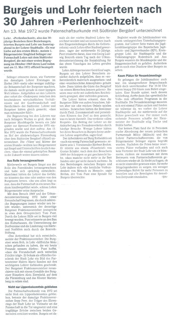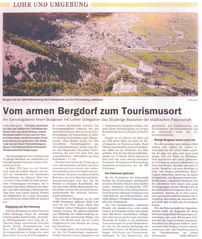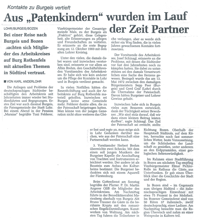 Am 13.05.1972 übergab Bürgermeister Gerd Graf in Burgeis in Anwesenheit der Sozialministerin Frau Waltraud Gebert-Deeg die Urkunde über die Patenschaft der Stadt Lohr mit der Dorfgemeinschaft Burgeis. Anlässlich des Cäcilienfestes besuchte eine Gruppe des Arbeitskreises Burgeis und der Geschäftführer Albin Brehm übergab ein Geldgeschenk des Arbeitskreises an Bürgermeister Sepp Peer für den Kulturhallenbau.